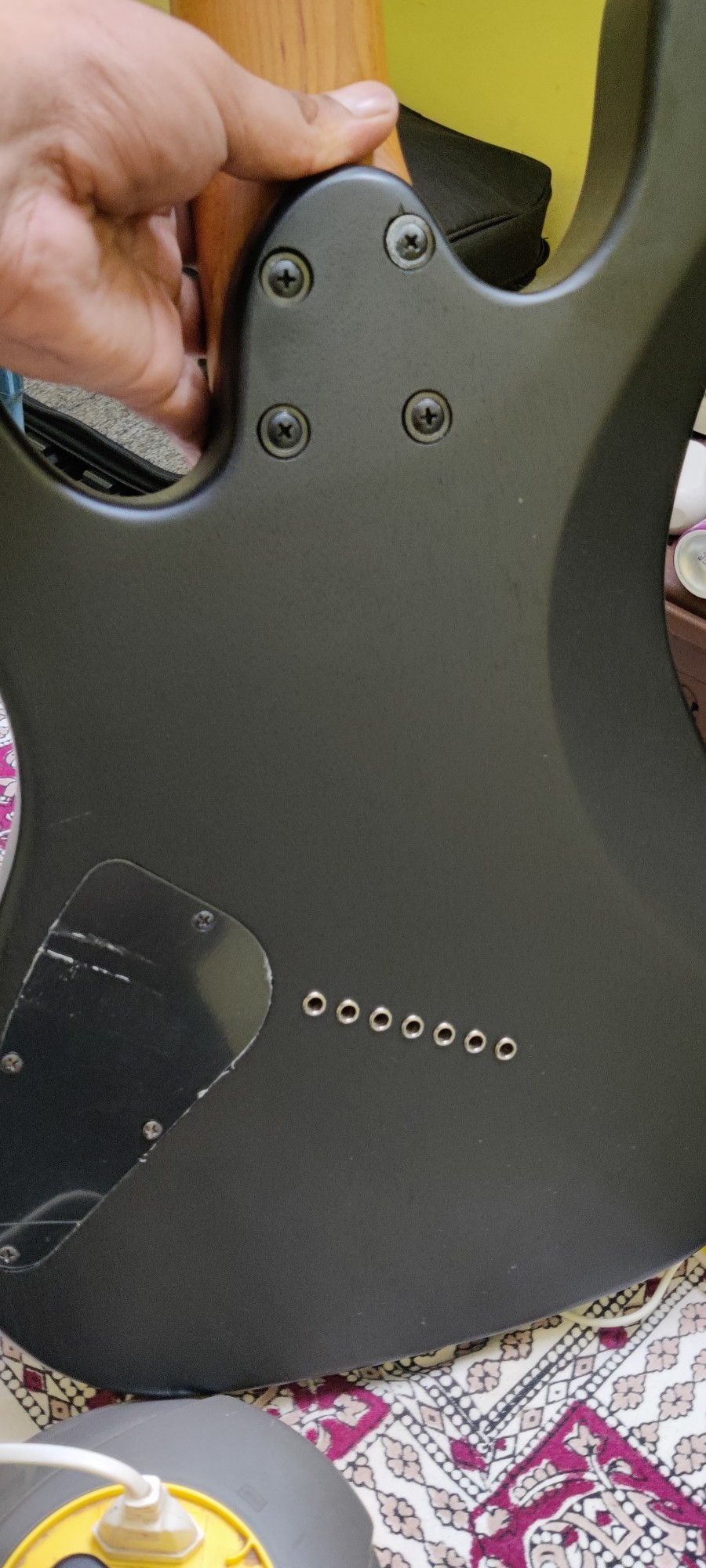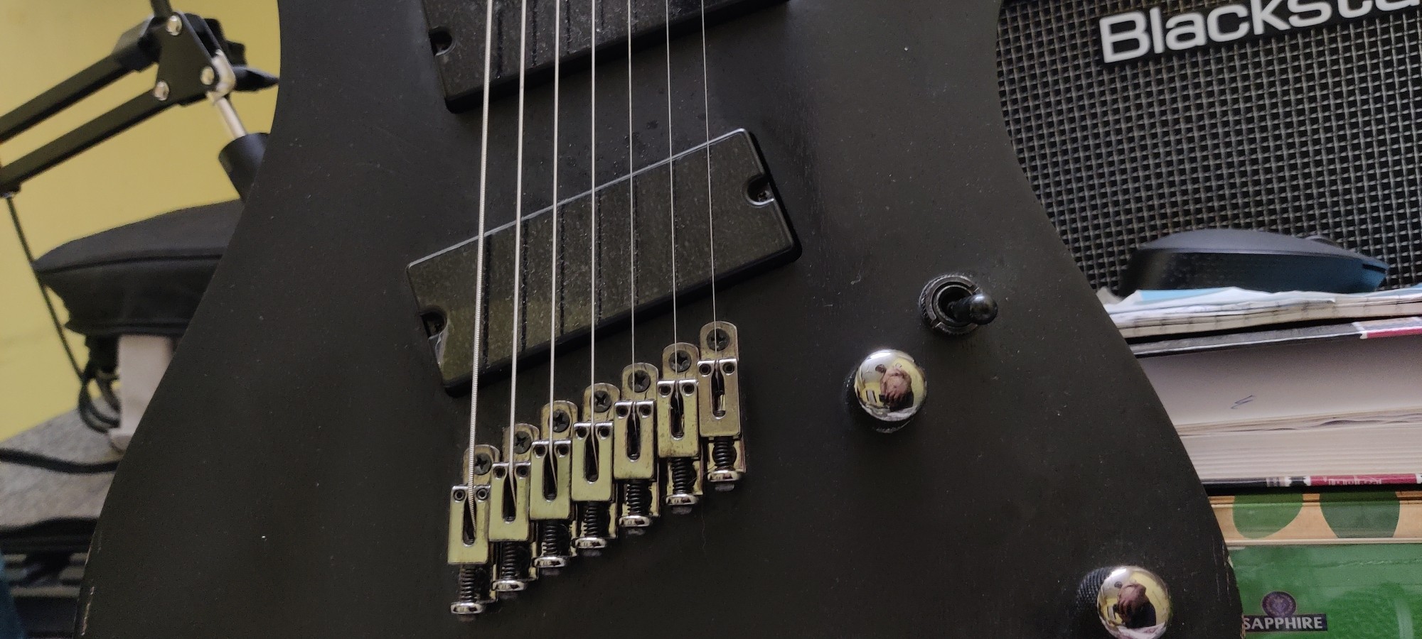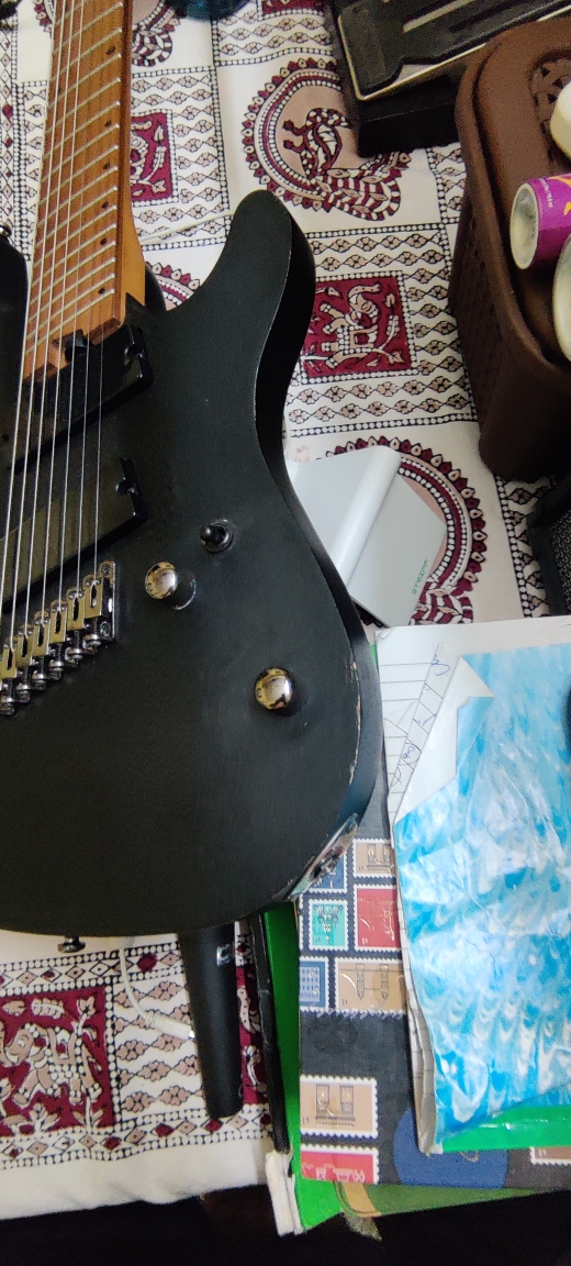 Small paint chip near the cable input due to the open pore concept. The condition is brand spanking new. DJENTS. Looks cool! Stickers on the pickguard and back cover and tuners intact. Comes with a gig bag. Used for recording but honestly belongs on a stage. Can play Meshuggah. Bengaluru Karnataka