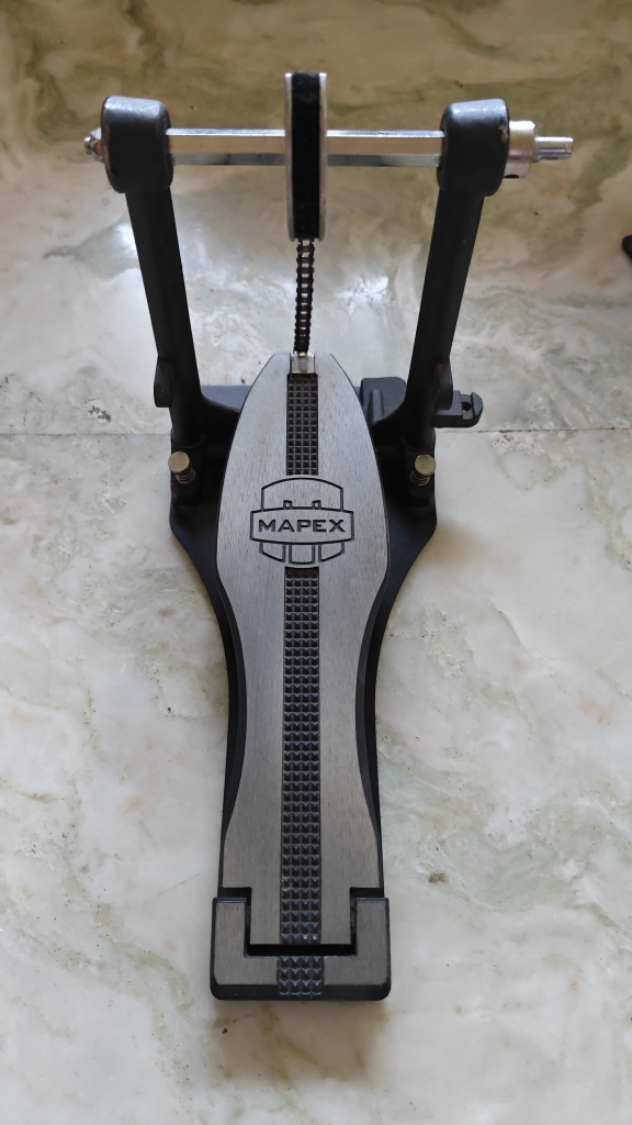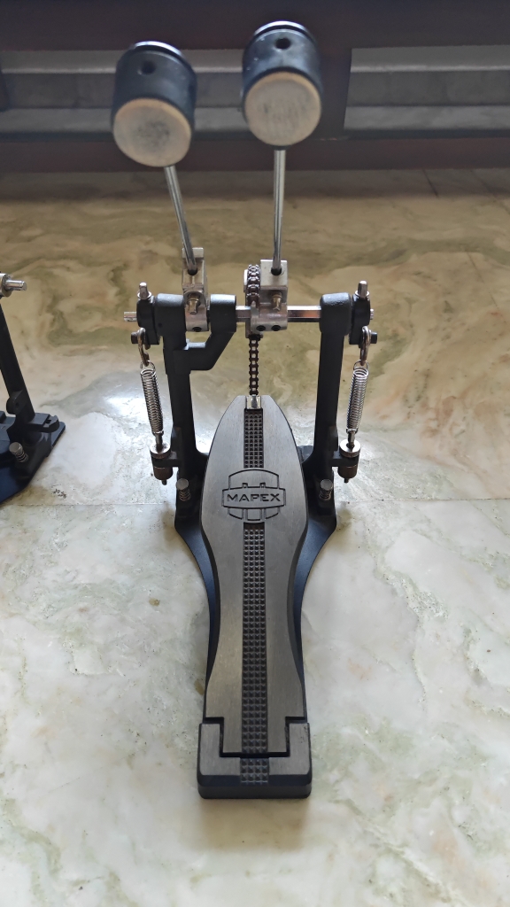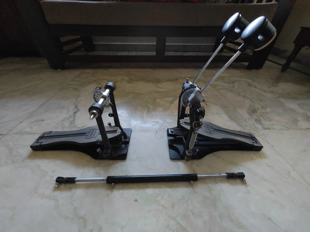 A beginner double bass pedal with a single chain. Fully functional despite regular cosmetic wear and tear on the pedals and connecting rod, and some chipping on the rod as well. Hyderabad Telangana