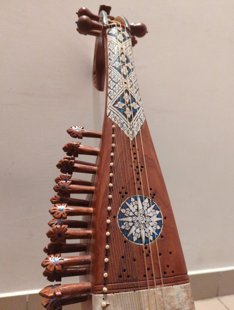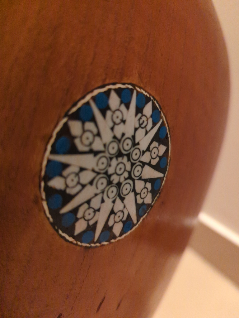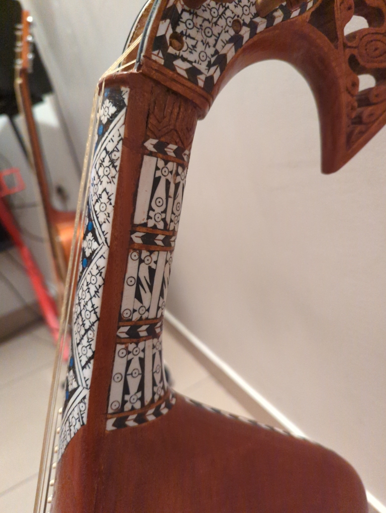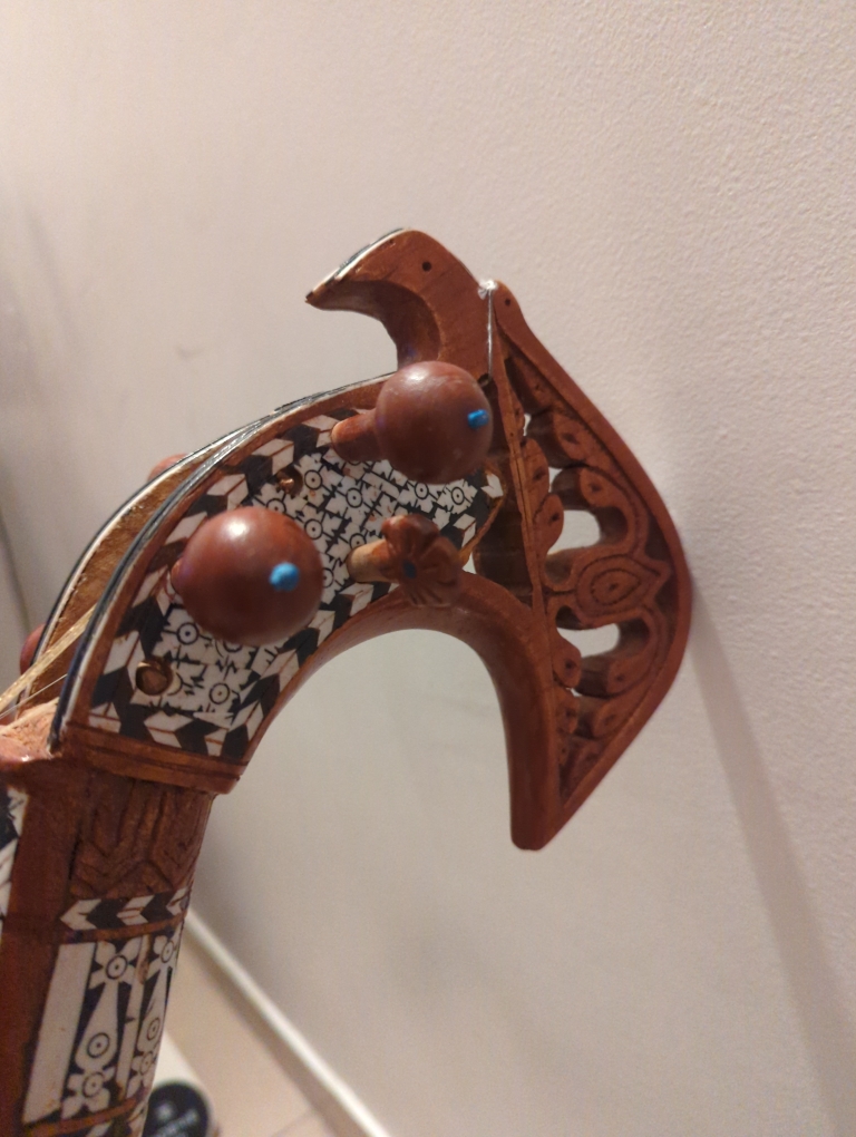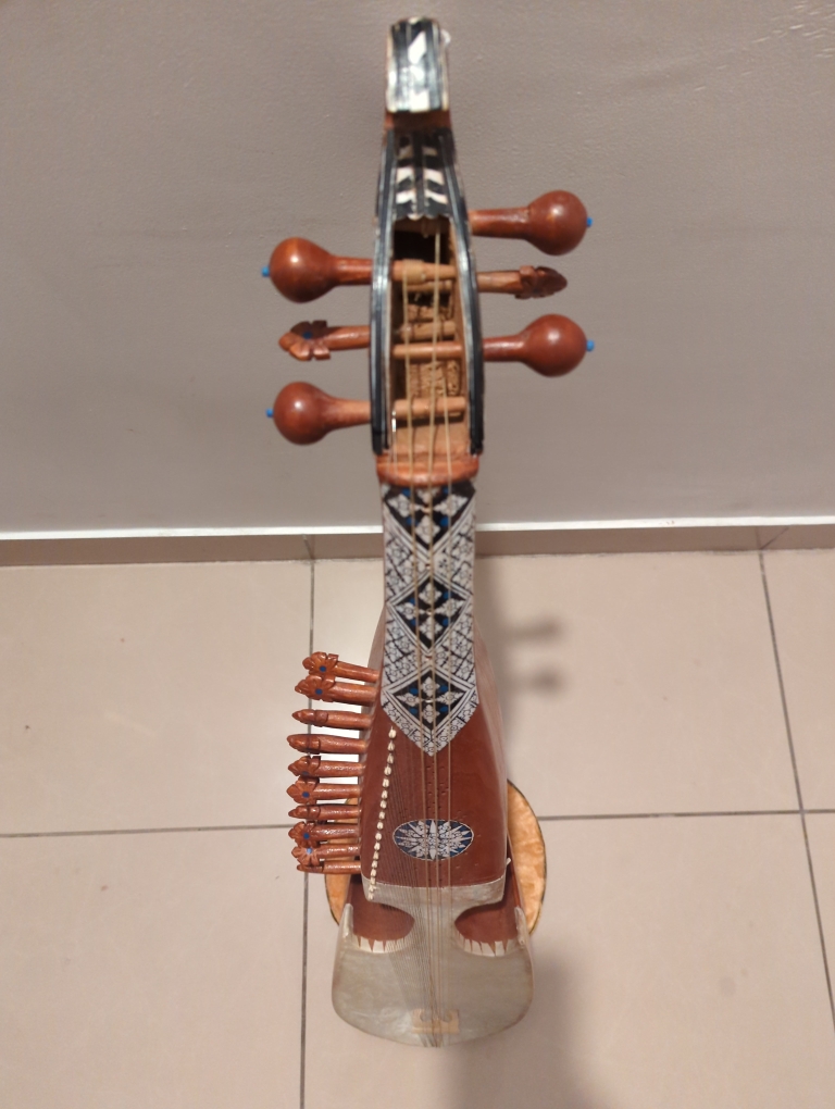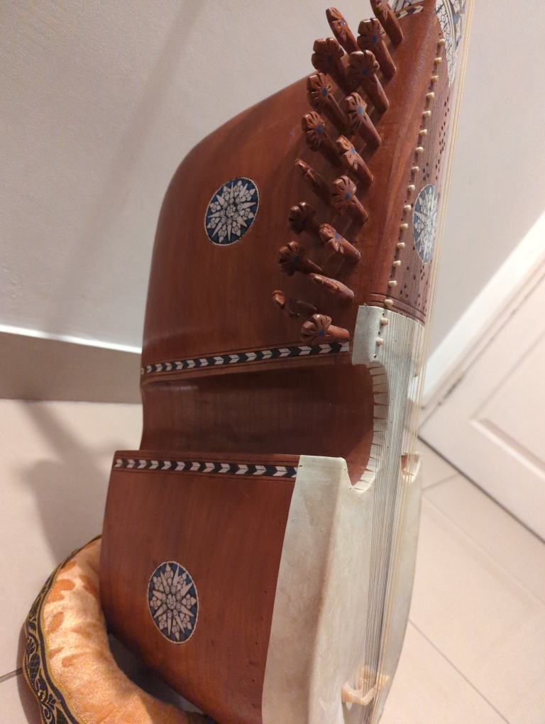 This rabab is made up of pure mulberry wood and has main four playing strings , 2 drones (chikari) and 17 sympathetic resonating strings please message me for negotiable price Hyderabad Telangana