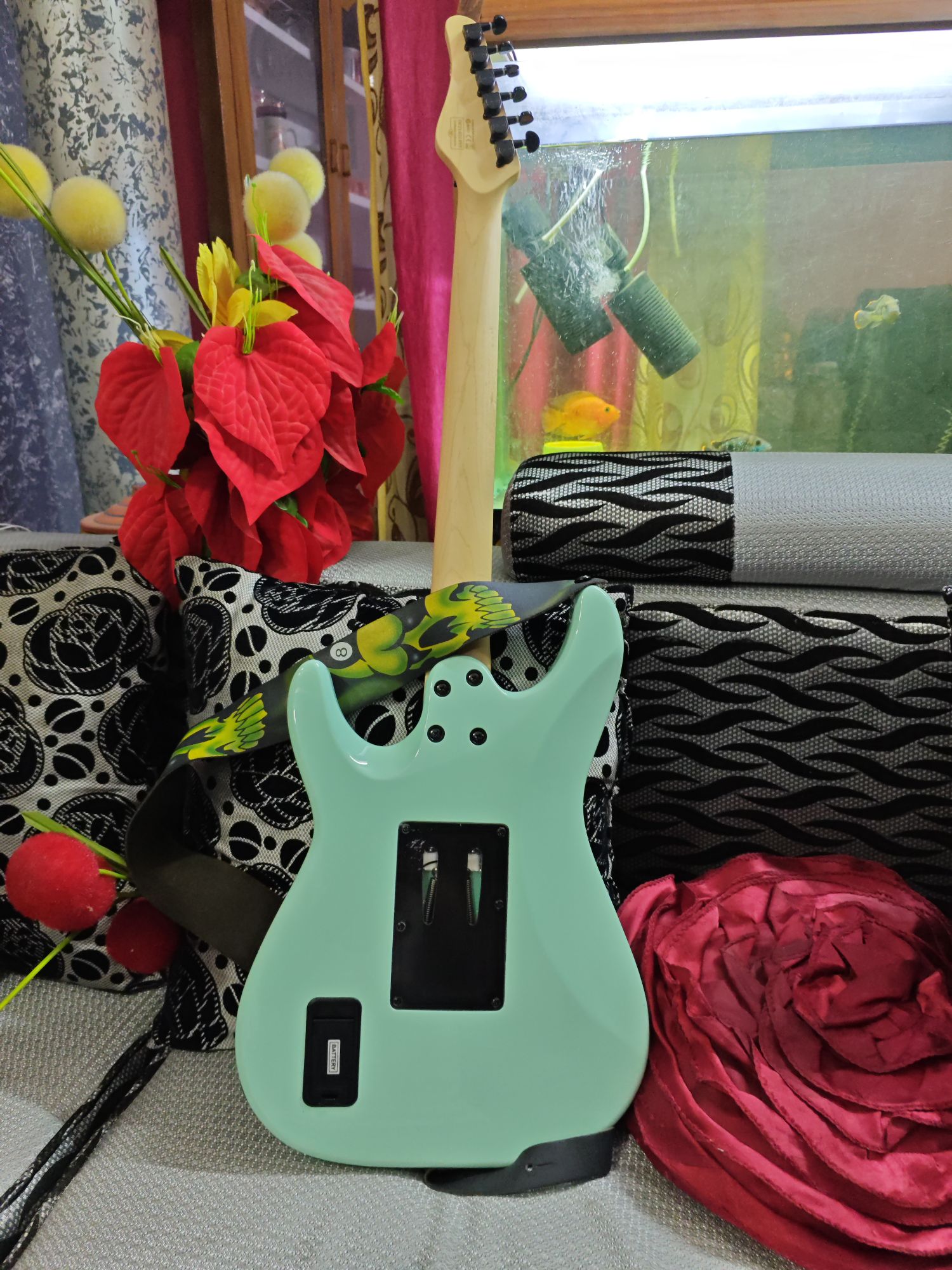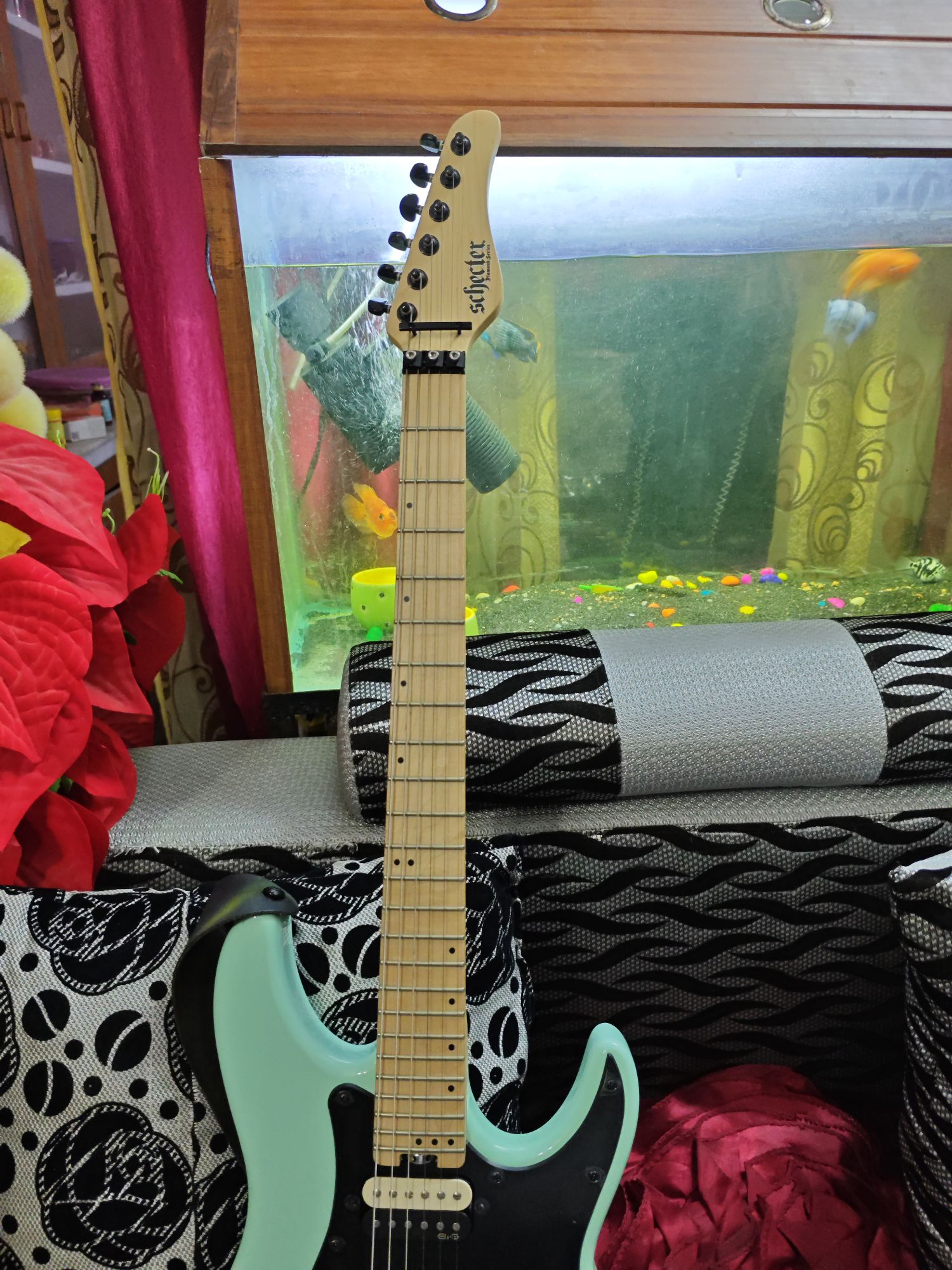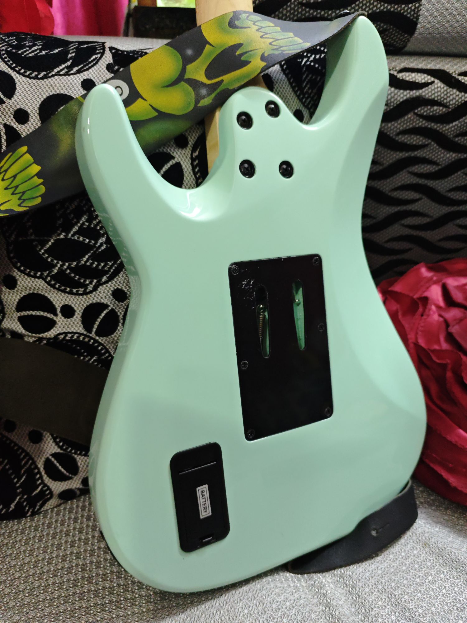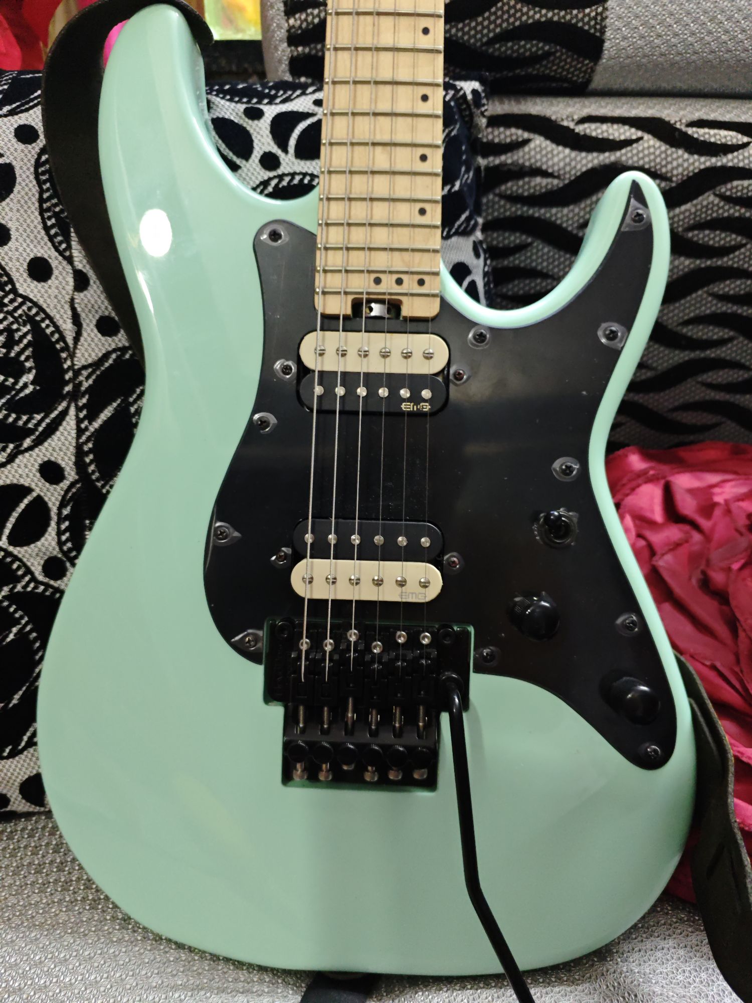 Schecter Sun Valley Super Shredder FR features Mahogany body, Maple fretboard, Maple neck, Thin "C" neck, 24 X-Jumbo jumbo, 14" fretboard radius, EMG Retro Active Hot 70 pickups. BODY Guitar Colors: Sea Foam Green (SFG) Hardware Color: Black Top Contour: Flat Top Dexterity: Right Handed Construction: Bolt-on Body Material: Mahogany Bridge: Floyd Rose Special 'Hot Rod' Locking Tremolo (Schecter Exclusive) ELECTRONICS Controls: Volume/Volume/3-Way Switch Bridge Pickup: EMG Retro Active Hot 70 Neck Pickup: EMG Retro Active Hot 70 Battery Compartment: 9-volt Clip-in Battery Compartment NECK Tuners: Schecter Fretboard Material: Maple Neck Material: Maple Inlays: Offset/Reverse Dots Scale: 25.5" (648mm) Neck Shape: Thin "C" Thickness: @ 1st Fret- .787" (20mm)/ @ 12th Fret- .866" (22mm) Frets: 24 X-Jumbo Fretboard Radius: 14" (355mm) Nut: Floyd Rose Special Nut Width: 1.625" (41.3mm) Truss Rod: 2-Way Adjustable Rod w/ Heel Access Spoke Wheel Dehran Dun Not Specified